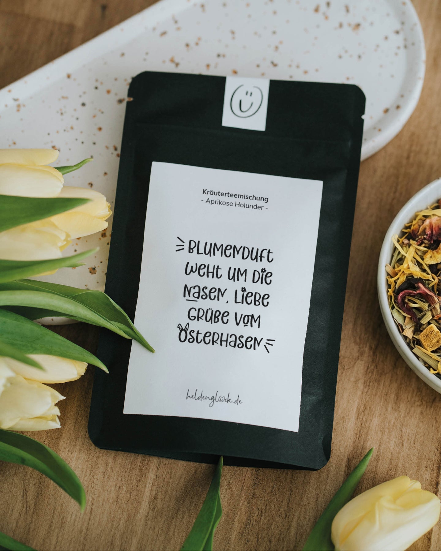 Du suchst ein Kräutertee Geschenk für das Osternest? Dieser Tee mit der Geschmacksrichtung „Aprikose Holunder“ und dem süßen Spruch „Blumenduft weht um die Nasen, Liebe Grüße vom Osterhasen“ ist das perfekte Mitbringsel für Freunde, Familie oder Kollegen – blumig, fruchtig und mit Herz.