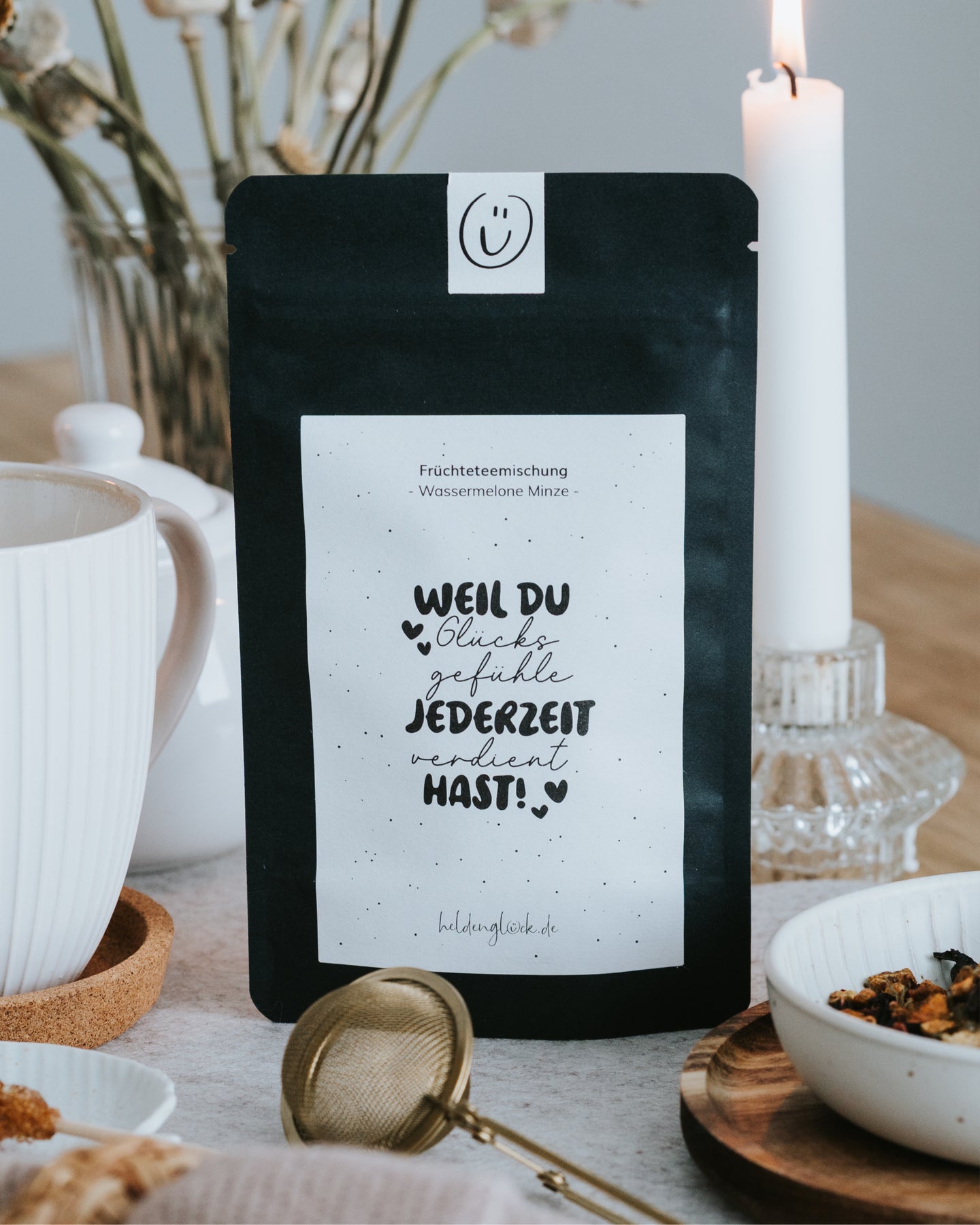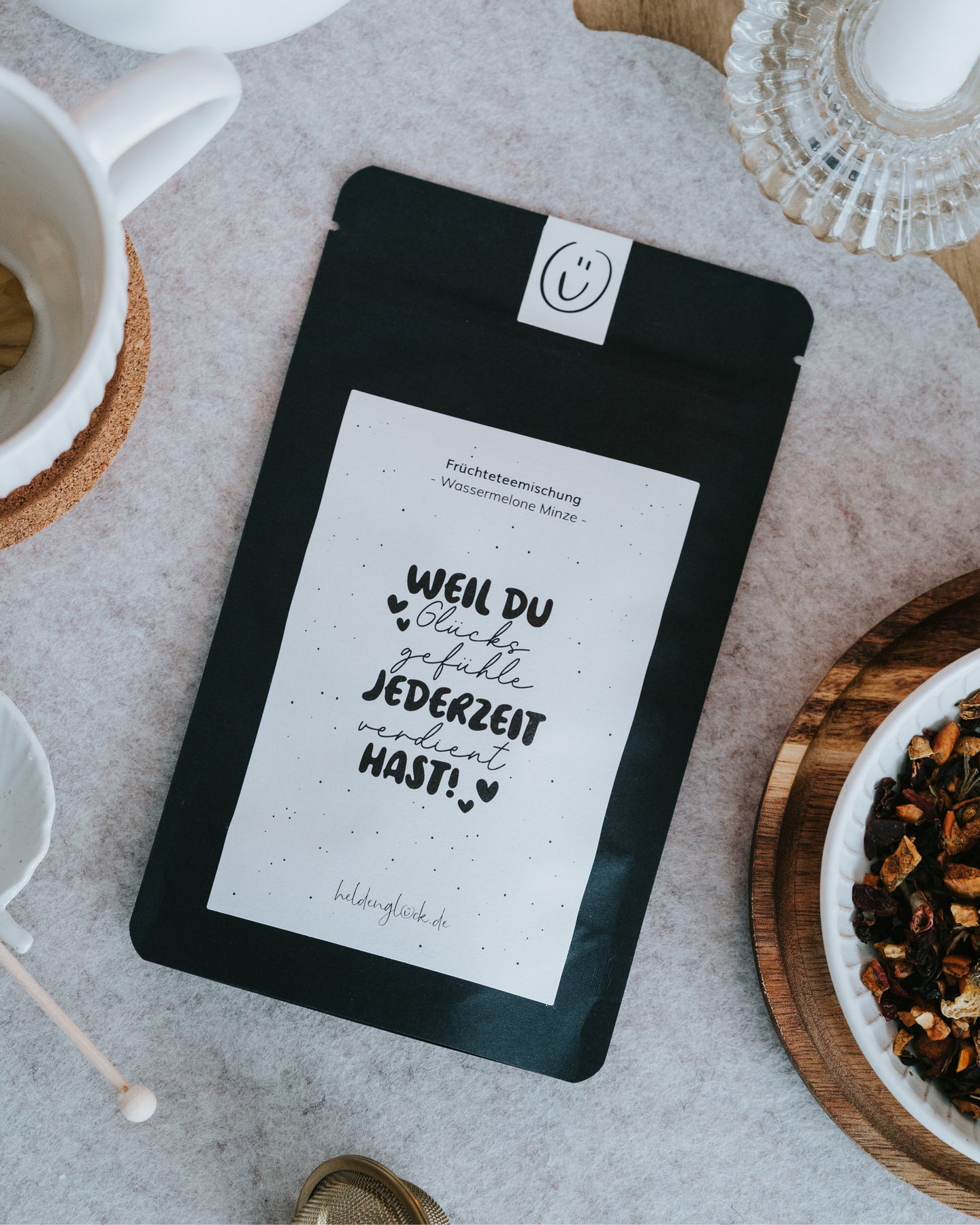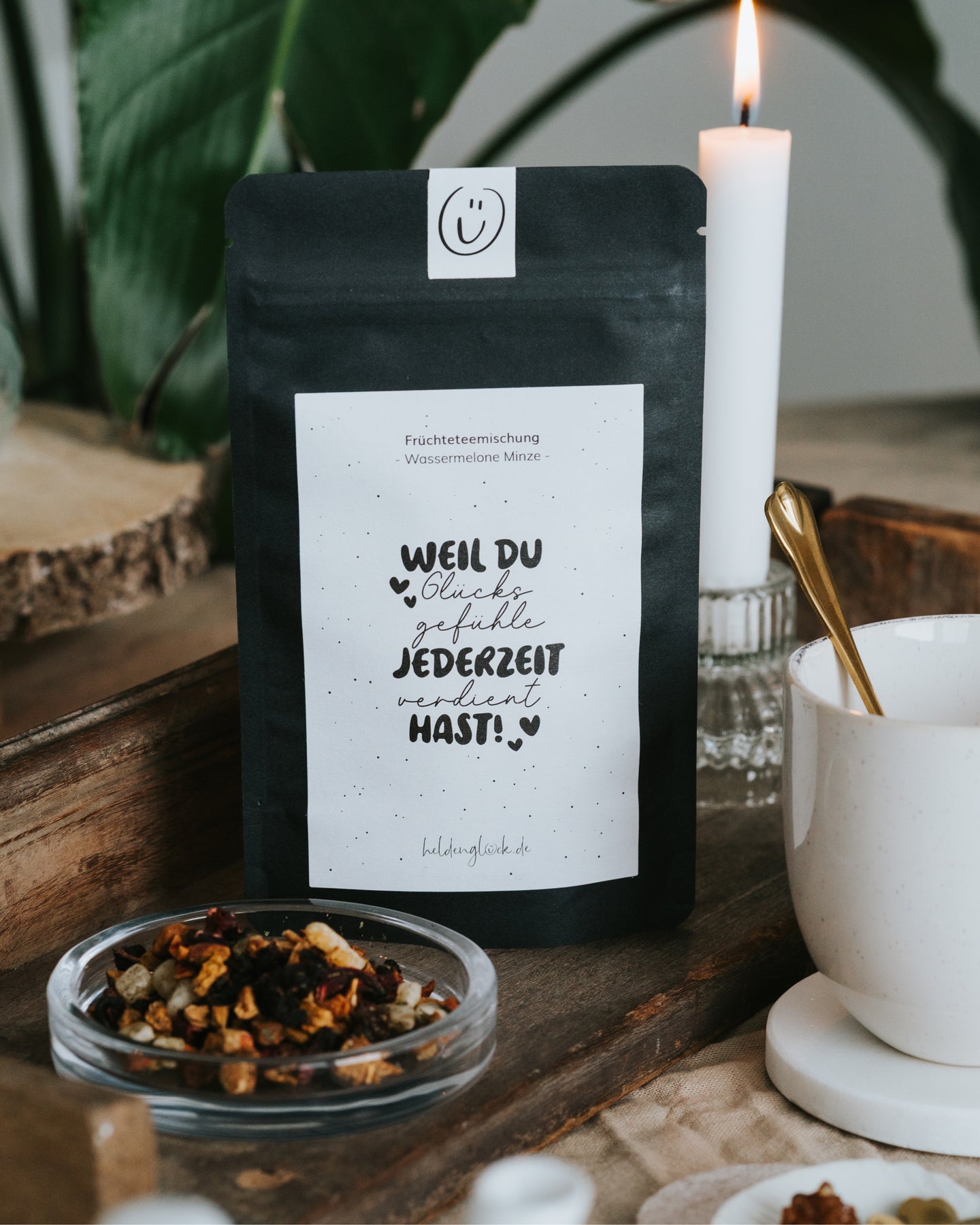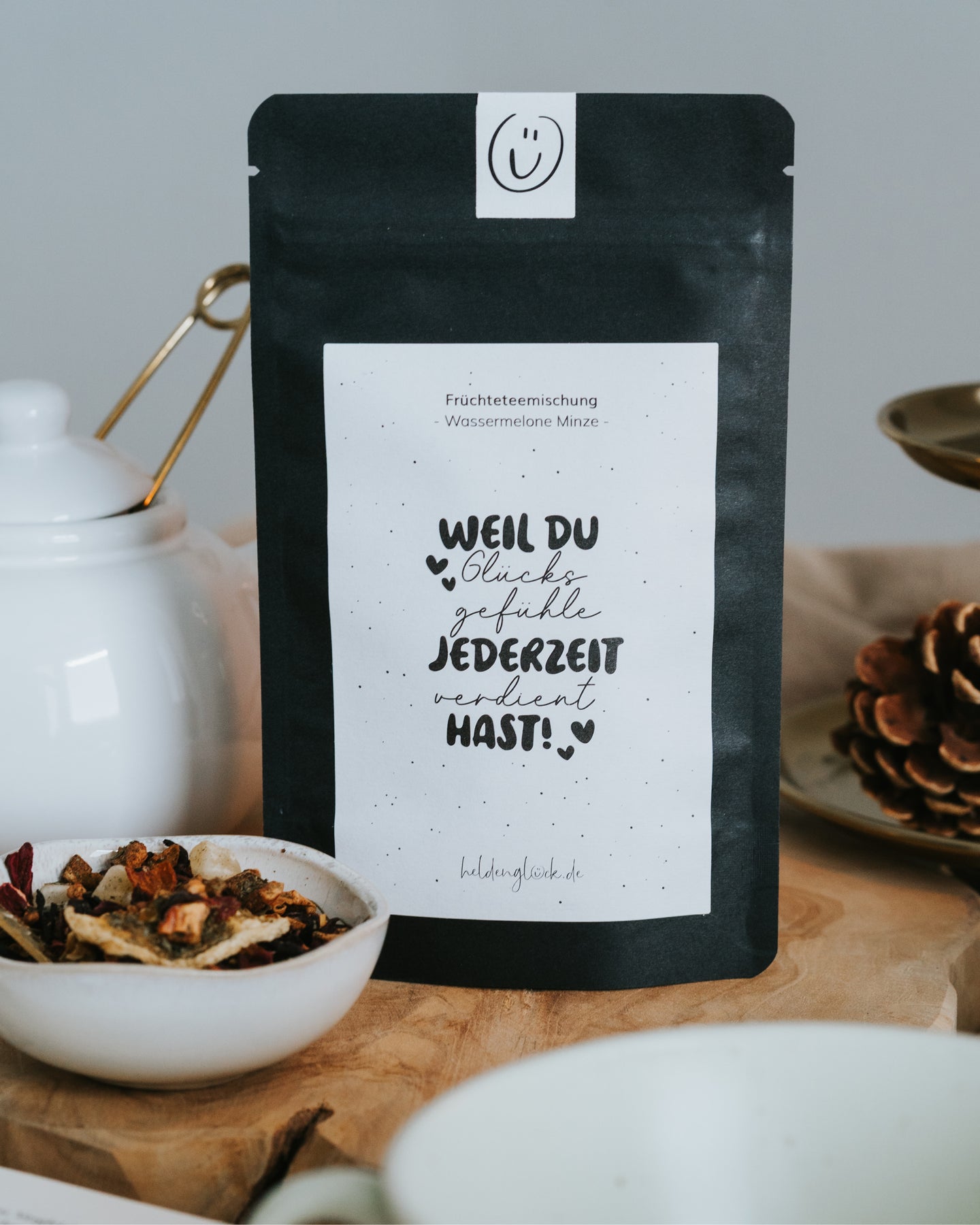 Unsere Früchtetee-Mischung „Wassermelone Minze“ vereint den süßen Geschmack von Melone mit der kühlen Frische der Minze. Ein Tee, der einfach glücklich macht – ob heiß an grauen Tagen oder eisgekühlt im Sommer. Die liebevolle Botschaft auf der Verpackung erinnert daran, dass du Glücksgefühle jederzeit verdient hast. Perfekt als kleine Aufmerksamkeit, Geschenk oder Seelentröster zwischendurch.
