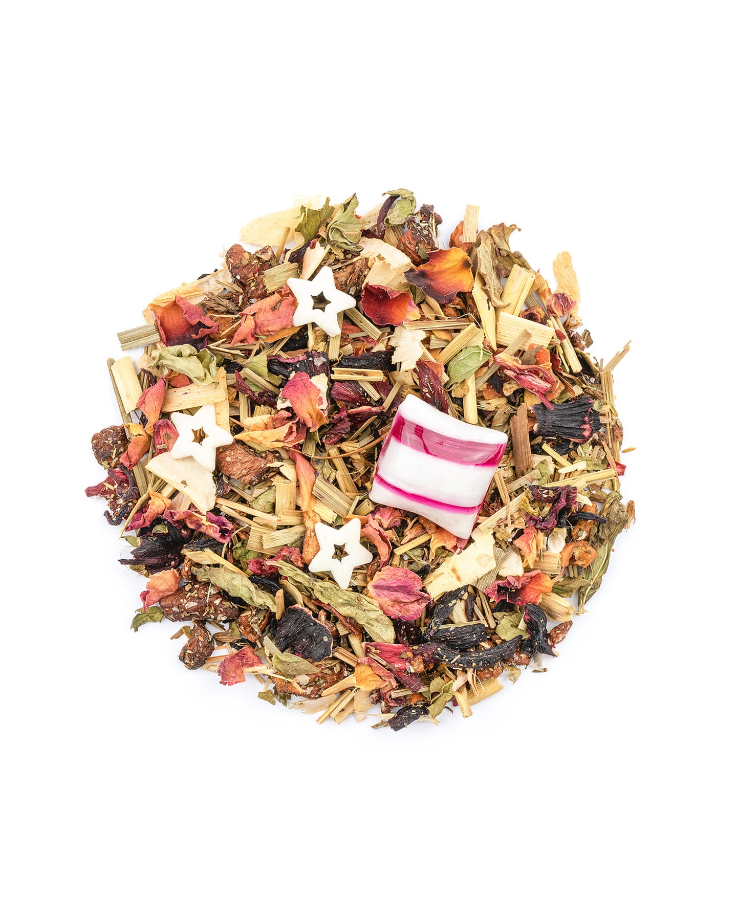 Zutaten: Apfelstücke (Apfel, Säuerungsmittel: Zitronensäure), Pfefferminzbonbons (Zucker, Glukosesirup, Pfefferminzöl, Menthol, Rote-Beete-Saftkonzentrat) (13 %), Hibiskusblüten, Aroma, Lemongras, Bohnenschalen, weiße Zuckersterne (Zucker, Reismehl, Kakaobutter, Kartoffelstärke), Karottenstücke, Nanaminze (3 %), Süßkraut, Rosenblütenblätter, Himbeerstücke.