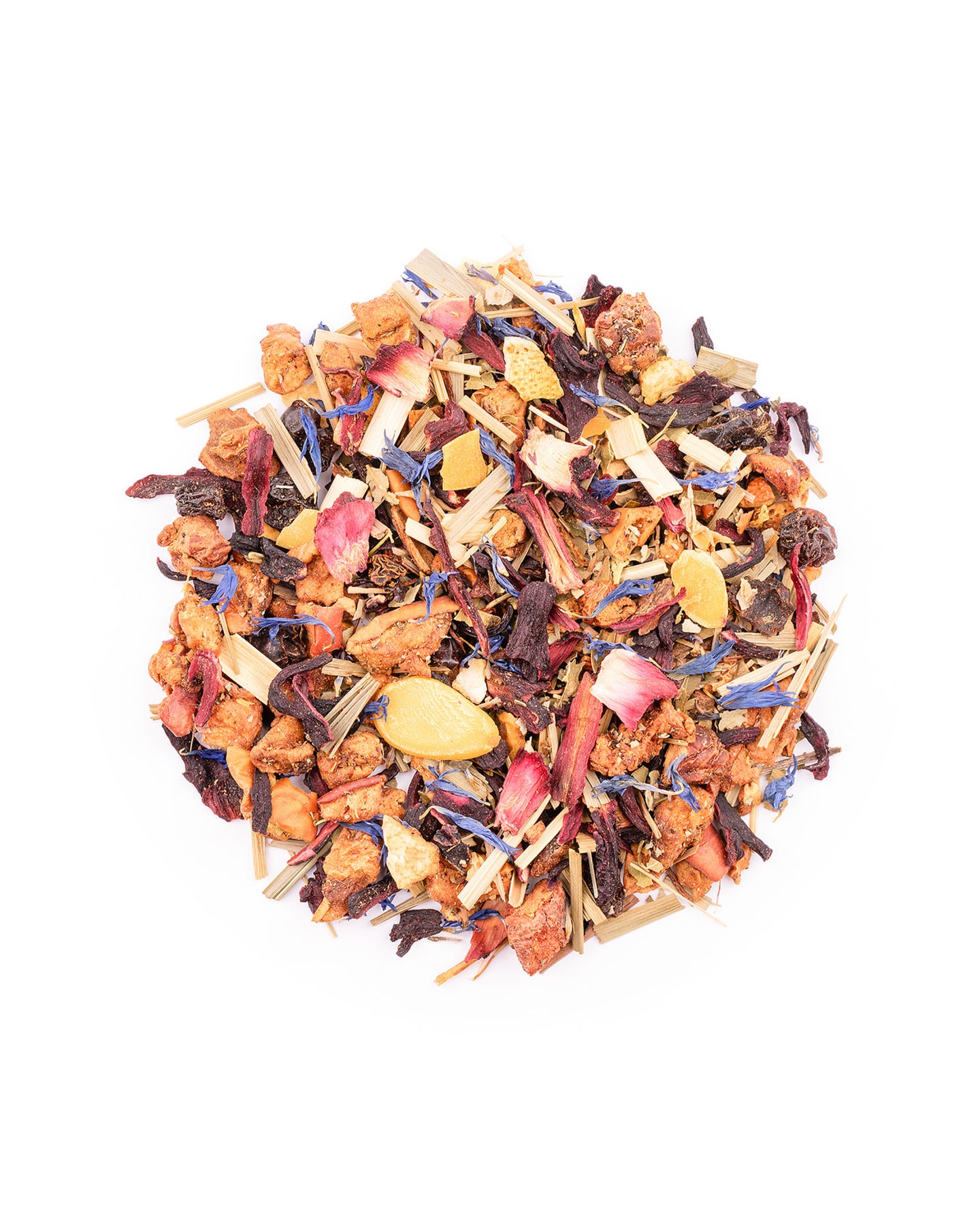 Zutaten: Apfelstücke, Hibiskusblüten, Lemongras, Orangenschalen, Hagebuttenschalen, Weinbeeren, Brombeerblätter, Aroma, Rooibos, Verbenenkraut, Silberlindenblüten, Sternanis, Zimtrinde (1 %), Kornblumenblüten, Mandelscheiben, Vanillestücke (0,5 %), Nelken.