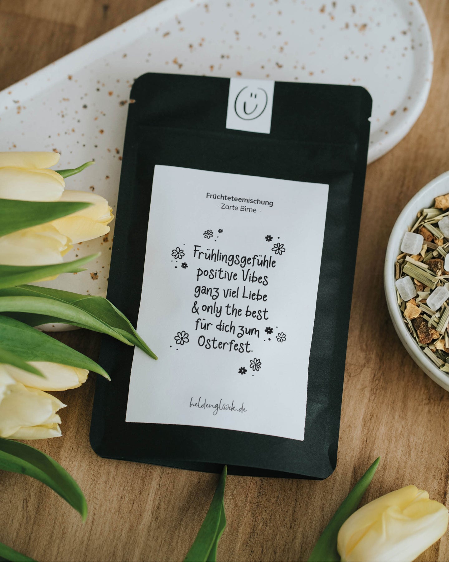 Du suchst ein Früchtetee Geschenk mit positiven Vibes? Dieser Tee mit der Geschmacksrichtung „Zarte Birne“ und dem herzlichen Spruch „Frühlingsgefühle positive Vibes ganz viel Liebe & only the best für dich zum Osterfest“ ist das perfekte Mitbringsel für Lieblingsmenschen – mild, aromatisch und mit Herz.
