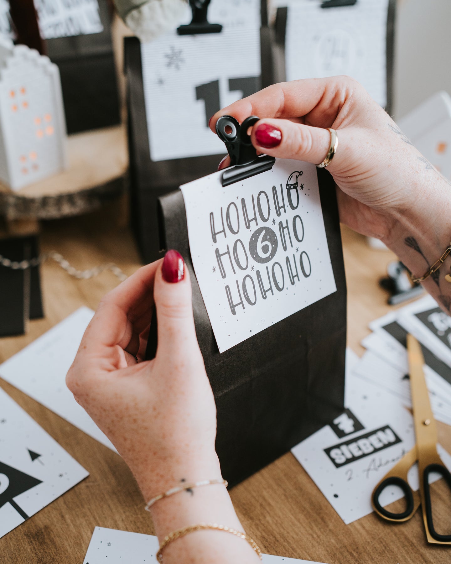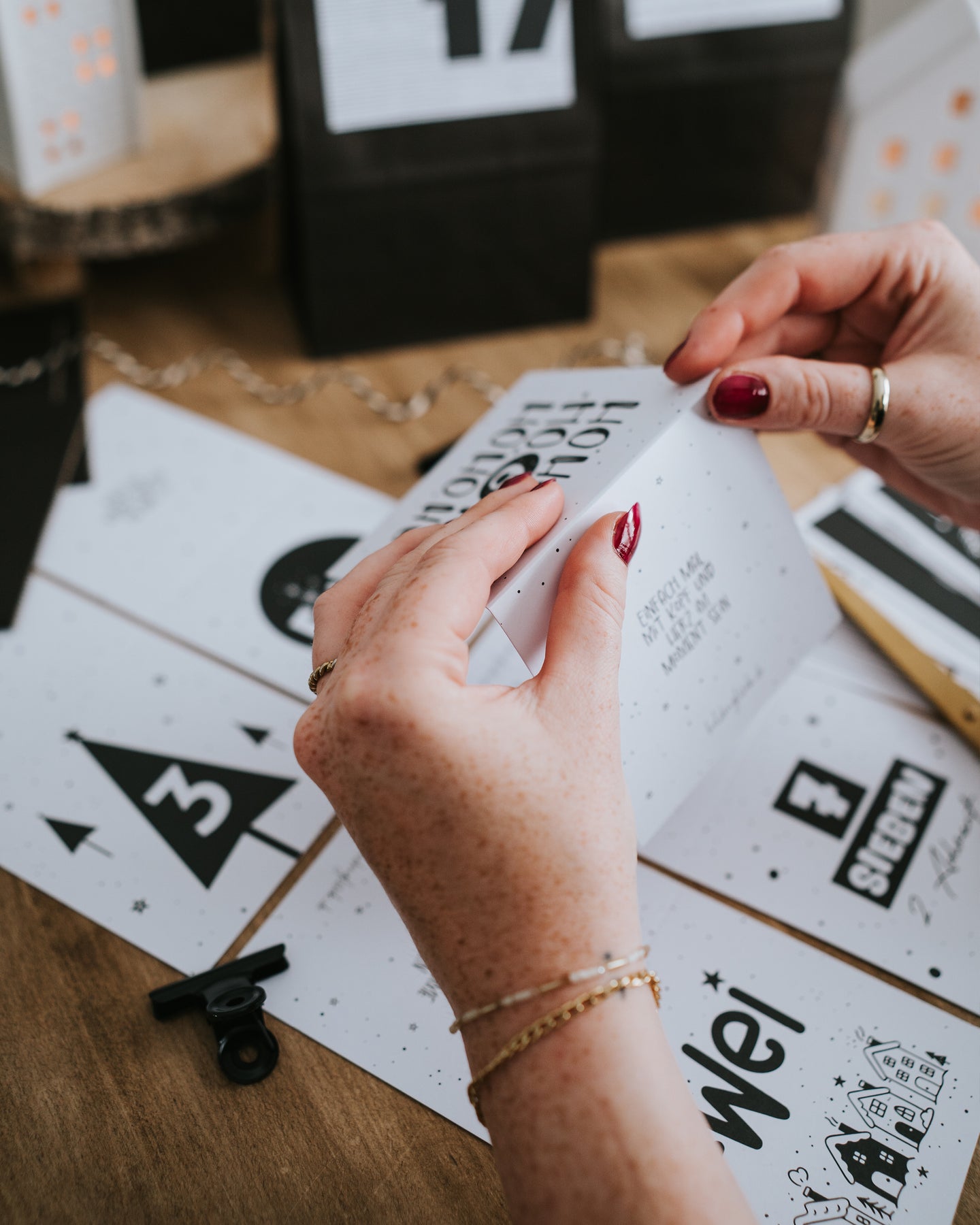 Falte die Kärtchen und stecke sie auf die gefüllten Tüten. Jeder Tag bringt nicht nur Vorfreude, sondern auch einen Gedanken, der dich durch den Advent begleitet.