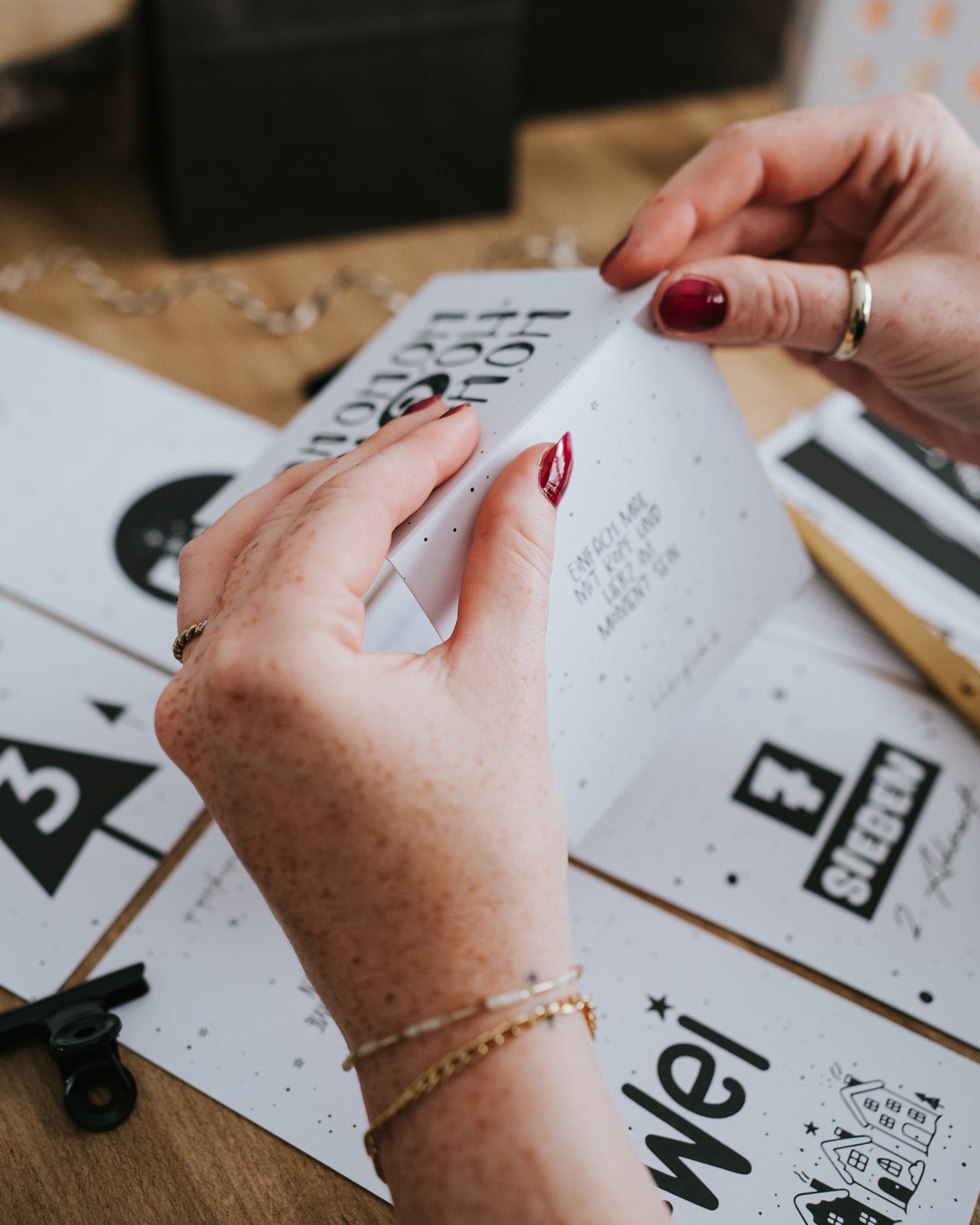Jede Karte ist individuell illustriert, nummeriert und mit kleinen Botschaften versehen – perfekt, um sie mit eigenen Ideen, Lieblingszitaten oder kleinen Botschaften zu kombinieren.