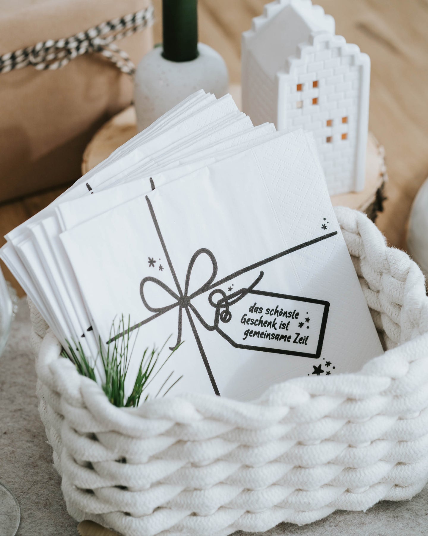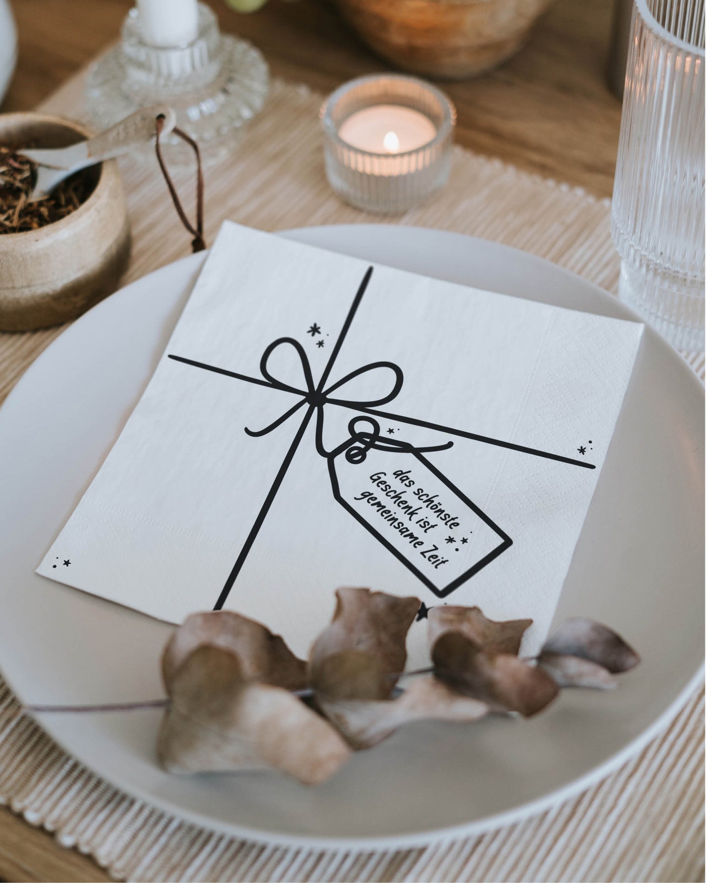 Stilvolle Weihnachtsserviette mit der Botschaft „Das schönste Geschenk ist gemeinsame Zeit“.