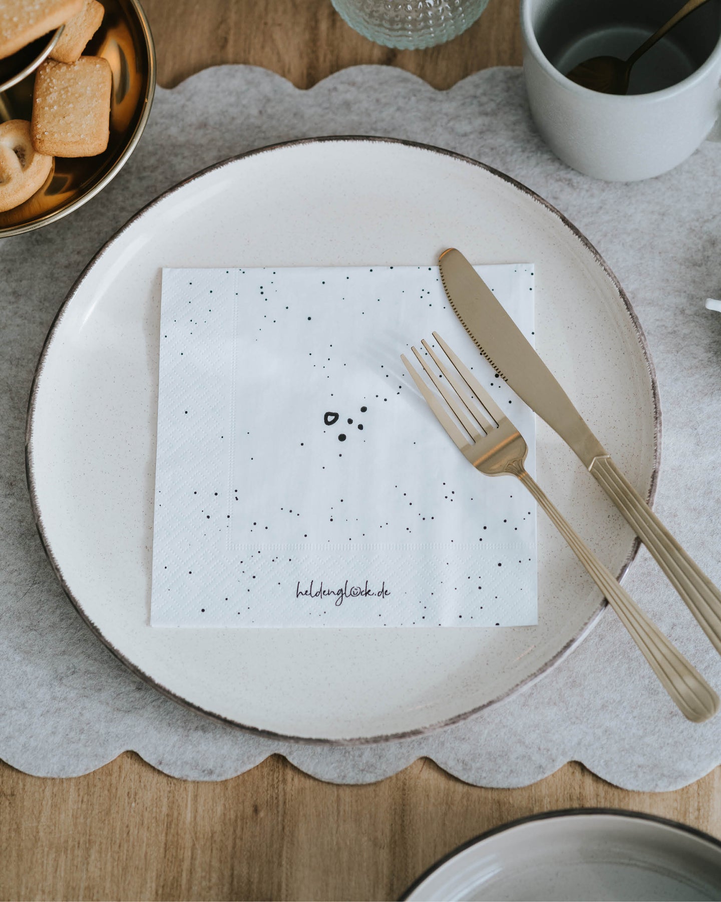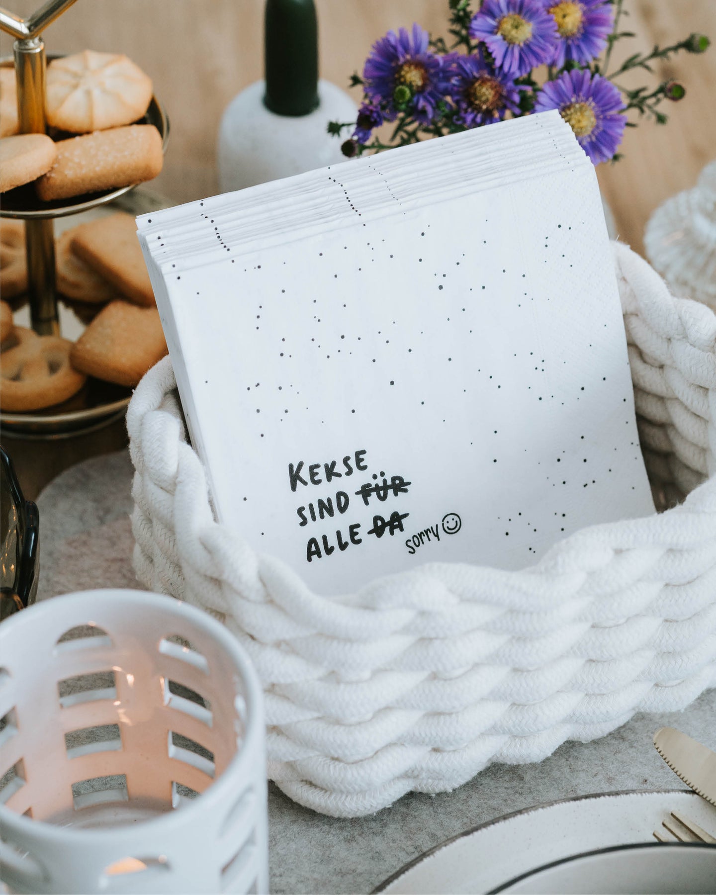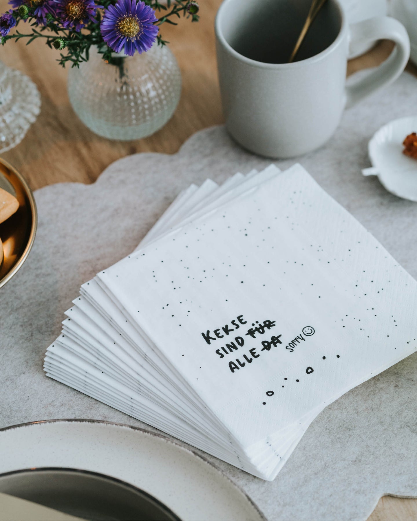 Stell dir vor, du deckst den Tisch für den Adventskaffee – schlicht, stilvoll, mit liebevollen Details. Und mittendrin diese Serviette: schwarz-weiß, mit dezenten Punkten, zurückhaltend und doch mit einer Botschaft, die deine Gäste schmunzeln lässt. Die Worte sind durchgestrichen, ein kleines „Sorry“ steht daneben – als hätte jemand eine süße Wahrheit zugeben müssen. Perfekt für alle, die wissen: Die schönsten Erinnerungen entstehen zwischen Zimtduft und leeren Tellern.